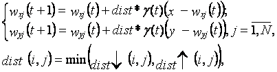 агде k - номер нейрона - победителя. - В соответствии с функцией притяженияа модифицируются весовые коэффициенты нейронной сети:а