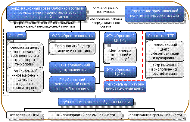 В Концепции социально-экономического развития России до 2020 года намечается создание межрегиональных и инжиниринговых центров, целесообразность которых также подтверждается орловским опытом. Еще в середине 90-х годов по инициативе МАЭВ Черноземье был разработан аван-проект межрегиональной инновационной инфраструктуры на базе создания в Орле такого центра. Хотя в рамках межрегиональной ассоциации эта идея не была реализована, в Орловской области формирование контура авнутрирегиональной инновационной структуры состоялось (рис.3).