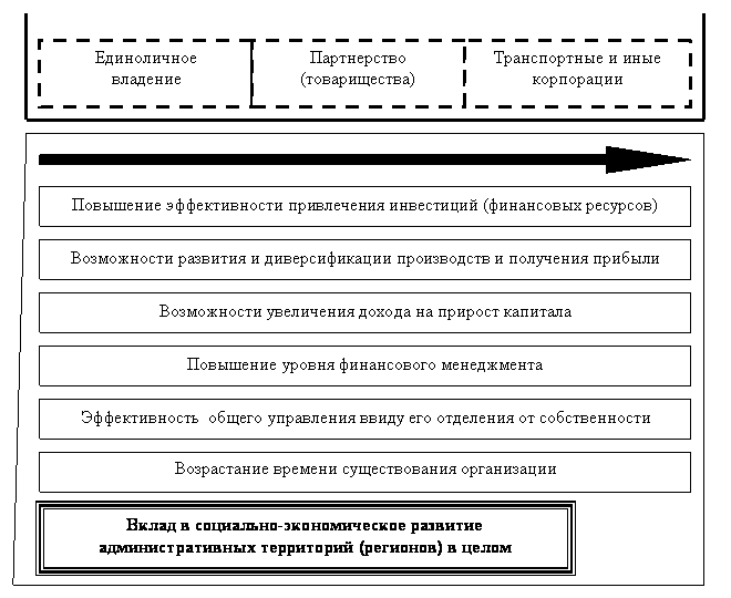 - обоснована концепция континуума организаций бизнеса по организационно-правовым формам, позволяющего выявить возможности эффективного сотрудничества общеотраслевых корпораций и представителей регионального бизнеса в части передачи от первых вторым некоторых хозяйственных функций и соответствующего имущества;