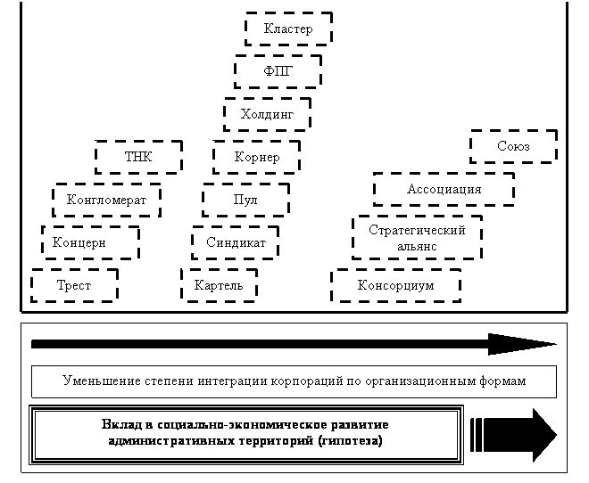 - обоснование концепций континуумов организаций бизнеса по формам собственности, по организационно-правовым формам и формам корпоративных объединений, на основании которых руководство общеотраслевых корпораций в процессе принятия решений может или должно учитывать интересы представителей регионального бизнеса и других экономических составляющих общества;