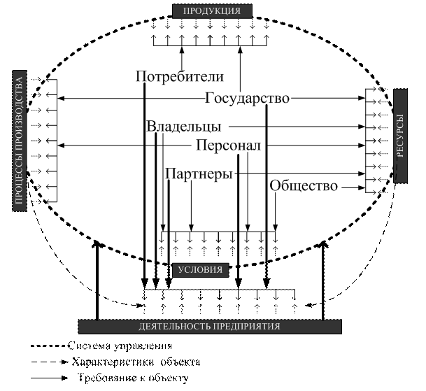 Принципиальным моментом в использовании понятия качество является идентификация носителей и направленности требований. Согласно логике стандарта ИСО 9000 носителями требований являются различные группы заинтересованных сторон. Однако вопрос о характере направленности данных требованийа и их использовании в системах управления и в теоретическом, и в практическом плане, до сегодняшнего времени остается открытым. Для возможности системного управления качеством с позиции современных представлений была смоделирована структура направленности требований заинтересованных сторон в отношении основных объектов деятельности предприятия (рис. 1), что позволяет обосновать в дальнейшем выбор характеристик различных объектов, используемых для управления. Проведенное структурирование не предполагаета последующего управления выделенными объектами в отдельности, а лишь визуализирует механизм формирования таких категорий, как Укачество продукцииФ, Укачество процессовФ, Укачество ресурсовФ, Укачество условийФа за счет идентификации характеристик данных объектов, соответствующих требованиям заинтересованных сторон.