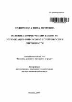Политика коммерческих банков по оптимизации финансовой устойчивости и ликвидности тема диссертации по экономике, полный текст автореферата