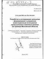 Разработка и исследование механизма формирования и управления инвестиционным потенциалом промышленного комплекса региона тема диссертации по экономике, полный текст автореферата