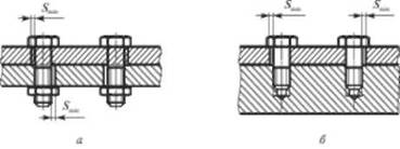 - тип В - зазоры для прохода крепежных деталей предусмотрены лишь в одной из соединяемых деталей (например, соединение винтами, шпильками) (рис. 5.63, б).