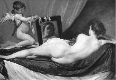 В последнее десятилетие жизни Веласкес создал три самых известных своих произведения. Может быть, под впечатлением тициановской "Венеры" он написал свою "Венеру перед зеркалом" (1651) - первое в испанском искусстве того времени изображение обнаженного женского тела. Венера написана со спины, ее торс как бы замыкает композицию с переднего плана, и только в зеркале, которое держит амур, отражается ее простое милое лицо. Такая замкнутая в самой себе композиция, по мнению многих исследователей, является характерной чертой искусства барокко. Множество оттенков розового и золотистого лепят объем прекрасного обнаженного тела, растворяющегося в насыщенной воздухом среде.
