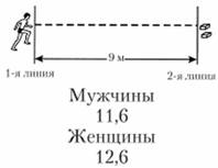 Метание мяча. Для теста с метанием можно использовать различные мячи: волейбольный, баскетбольный, теннисный. Расстояние метания, высота цели достаточно вариативны. Результативность теста оценивается по количеству попаданий. Обычно предлагается выполнить 10 попыток.
