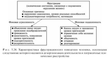 Выраженные формы негативных эмоциональных состояний, такие, как плохое настроение, стрессы, аффекты, часто приводят к особому виду психологического состояния (поведения), называемого фрустрацией (от лат. гг^т-гатло - обман, тщетное ожидание) (рис. 5.23). Фрустрационное поведение яатяется следствием длительных неуспехов в удовлетворении потребностей и желаний человека. Общим прояатением фрустраций яатяется появление у человека "чувства крушения", невозможности преодоления препятствий. В результате возникают разные типы нарушений поведения. Это, во-первых, нарушения самооценки, когда люди отрицают факт постигших их неудач, приписывают эти неудачи проискам