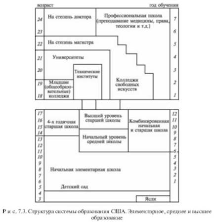Обучение в различных учреждениях высшего образования продолжают более 50% выпускников средней школы (65; 66). Множественность образовательных возможностей видна из рис. 7.3. Выпускники старшей школы, численность которых включает около 92% всех детей данного возраста, могут поступать в 2-годичные младшие колледжи, в 2-3-годичные технические колледжи, колледжи свободных искусств, профессиональные школы и университеты. Младшие колледжи дают возможность получения "начального" высшего образования, курсы этих колледжей засчиты-ваются учащимся при их дальнейшей учебе в 4-годичных колледжах и университетах.