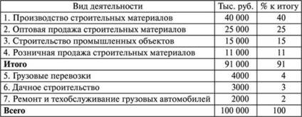 По данным условного примера ОАО "Красная черепица" осуществляет разные виды деятельности, по которым известны объемы продаж (табл. 7.3).
