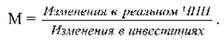 Было также замечено, что изменение размеров инвестиций ведет к изменению объемов производства и росту доходов в неодинаковых пропорциях. Если инвестиции возрастают, предположим, на 5 млрд руб., то совокупный доход может увеличиться в течение года на 15-20 млрд руб. Этот результат получил название эффекта мультипликатора. Мультипликатор - это соотношение отклонения от равновесного чистого национального продукта и изменения в расходах на инвестиции, т.е.