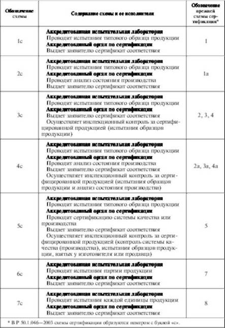 В табл. 6.2 приведены обозначение схем, их содержание и исполнители, а также их обозначение из числа схем сертификации, установленных Изменением № I "Порядка проведения сертификации продукции в Российской Федерации".