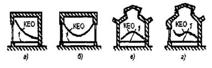 Рис. 5.1. Распределение КЕО при различных видах естественною освещения: а Ц одностороннее боковое освещение; б Ц двустороннее боковое освещение; в Ц верхнее освещение; г Ц комбинированное освещение; 1 Ц уровень рабочей поверхности
