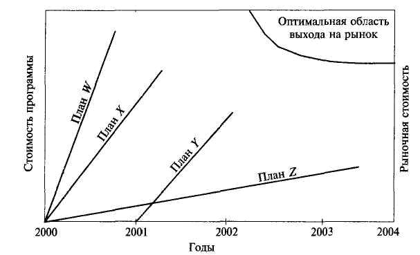 На рисунке 22 представлена графическая модель типичной ситуации. Для каждой продуктовой или технологической инновации существует определенная оптимальная временная область выхода на рынок. Программы инноваций приводят к результату в разные моменты времени. Следует выбирать такой план (X или Y), который даст результат в тот момент, когда спрос на него на рынке начал расти. При этом программу инноваций следует начинать возможно позже, с тем чтобы иметь максимально полную информацию.