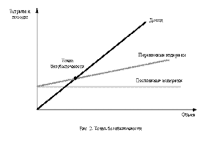 Анализ затрат, объема продукции и прибыли (CVP - анализ) называют анализом безубыточности. Он состоит в нахождении точки на координате объема продукции, соответствующей пересечению прямой общих издержек с прямой дохода от продаж, представлен на рис. 2