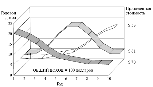 На этом графике общий доход равен 100 долларам при любом сценарии. Однако эта сумма может быть получена по трем разным схемам. Эти схемы имеют ощутимо разные приведенные стоимости, и читатель может заметить, что схема, при которой наибольший доход поступает вначале, имеет максимальную приведенную стоимость.