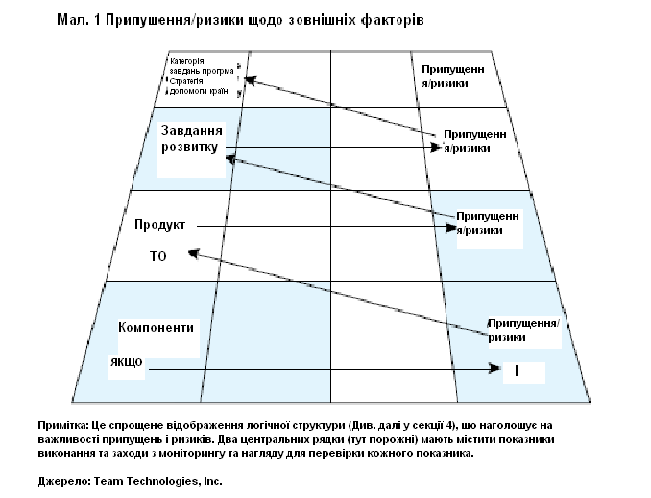 Припущення – це фактори ризику або сприятливі фактори, тобто певні зовнішні умови, які знаходяться поза межами прямого контролю проекту (Рис. 1). Досягнення завдань може залежати від того, наскільки справдяться припущення. Припущення робляться стосовно ступеня невизначеності (ступеня ризику) між завданнями різних рівнів. Чим менше невизначеності щодо того, чи справдяться певні припущення, тим міцніша структура проекту. Невдалі припущення можуть зруйнувати проект так само, як і погана робота над отриманням продуктів.
