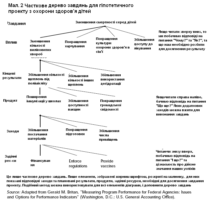 Для будь-якого проекту перелік показників результативності його виконання має розроблятися в рамках логічної структури. Розробка показників результативності починається із цілей проекту та відображає споріднену ієрархію заходів, їх продуктів та бажаних кінцевих результатів щодо кожного компоненту проекту. Здійснені заходи та досягнуті результати завдань нижчого рівня – це задіяні ресурси для досягнення завдань проекту більш високого рівня, наприклад на інституційному, секторальному, програмному чи державному рівні. 5 Виходячи з цього, визначення показників на кожному рівні тісно пов’язано із кінцевою метою проекту, яка може бути скромною (наприклад, зменшити рівень захворюваності на попереджувальну хворобу у певній групі населення шляхом збільшення імунізації), або більш амбіційною (зменшити смертність серед дітей).