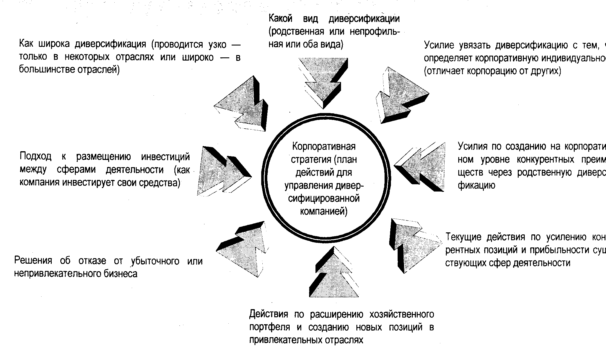 Основное понятие. Корпоративная стратегия состоит в том, как диверсифицированная компания утверждает свои деловые принципы в различных отраслях, а также в действиях и подходах, направленных на улучшение деятельности групп предприятий, в которые диверсифицировалась компания.