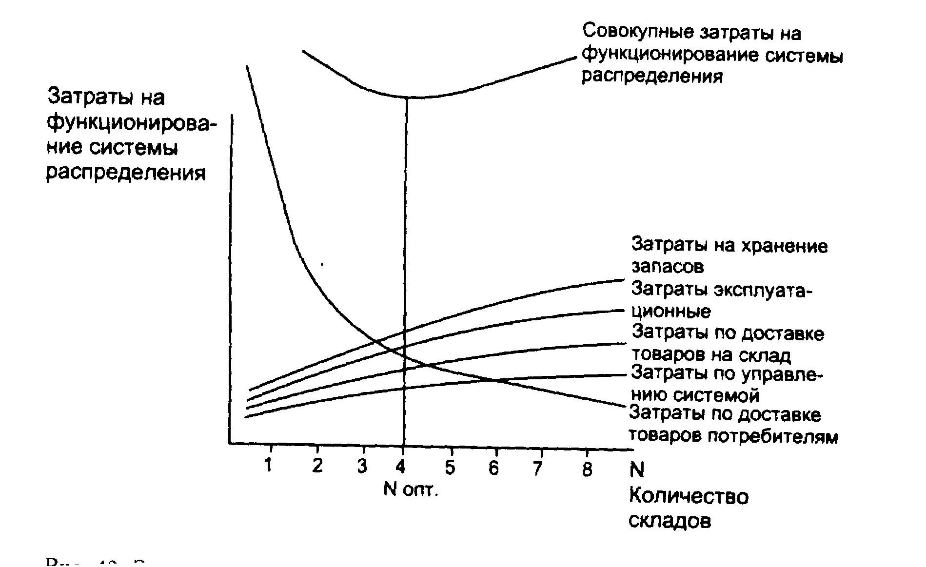 Рис. 42. Зависимость затрат, связанных с управлением распределительной системой, от количества входящих в нее складов