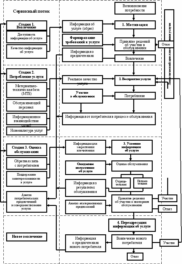 Последовательно отображая особенности взаимодействия потребителя и поставщика услуги от формирования требований к обслуживанию до привлечения новых потребителей, модель, приобретая циклический характер, формирует различные так называемые конфигурации потоков разного вида: сервисные, информационные и другие.