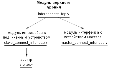 Модуль верхнего уровня содержит объявления модулей интерфейсов с подчиненными устройствами, устройствами мастеров и объединяет эти устройства, подключенные к нему.