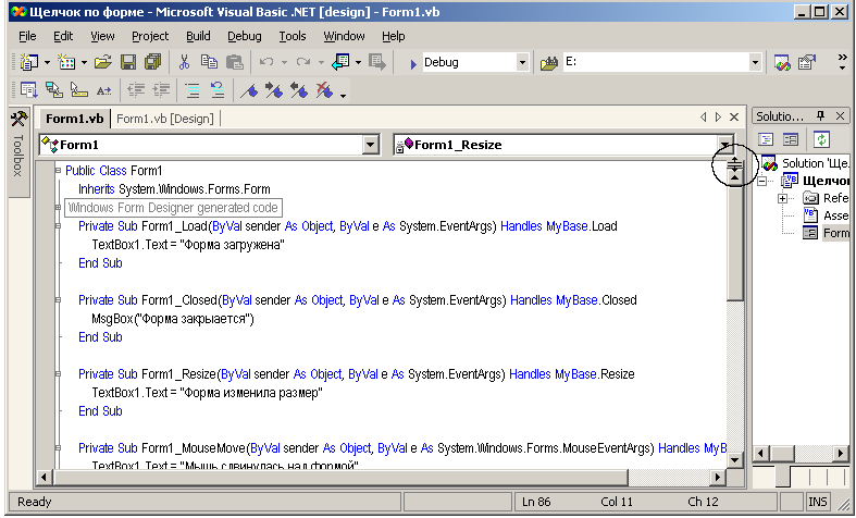 F1. Если вы хотите узнать подробности о каком-то слове из вашей программы, например, Width, вы щелчком мыши ставите на него текстовый курсор и нажимаете на клавиатуре клавишу F1. Появляется окно с пояснениями или указаниями (обычно оно присоединяется к центральной группе окон). Вы узнаете, какому классу принадлежит интересующее вас свойство или, скажем, метод. Если вы спрашиваете об объекте, то узнаете, какому пространству имен принадлежит его класс. По ссылке Members (компоненты) из окна помощи узнаете все свойства, методы и другие элементы, принадлежащие данному классу. Свойств здесь, между прочим, вы найдете больше, чем в окне свойств, так как здесь приведены и те свойства, которые имеют смысл только в режиме [run]. Например, свойство SelectedText объекта TextBox, которое выдает фрагмент текста, выделенного нами в текстовом поле.