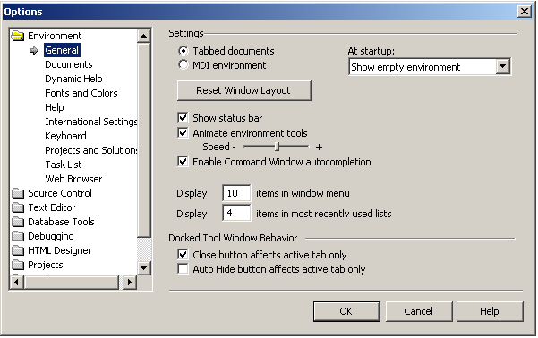 Здесь нам интересен пункт Options, который позволяет настраивать среду VS, то есть регулировать внешний вид и поведение окон, панелей инструментов и других элементов среды. Будьте осторожны и не меняйте настроек, которых вы не понимаете, иначе VS будет вести себя непривычным или неприятным образом. Некоторые настройки вступают в действие не сразу, а только после перезагрузки VS.
