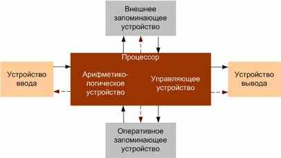 - Управляющее устройство – обеспечивает управление и контроль всех устройств компьютера (управляющие сигналы указаны пунктирными стрелками)