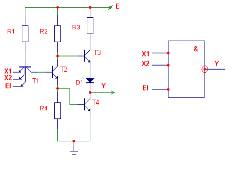 На выходе этой схемы будет высокий уровень при условии, что Т1 и Т2 закрыты. Если хотя бы один из транзисторов открыт, то на выходе устанавливается низкий уровень, который определяется напряжением UКЭн открытого транзистора.