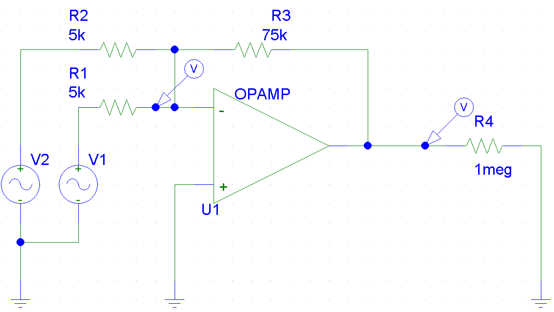 Соберите схему, представленную на рис. 2. Проведите анализ переходных процессов с параметром Final Time = 100ms. Параметры источника синусоидального напряжения: DC = 0, AC = 1, VOFF = 0, VAMPL = 15, FREQ = 50. Зарисуйте полученные осциллограммы. Сравните полученную экспериментально и рассчитанную теоретически величину выходного напряжения. Для данной схемы выходное напряжение: