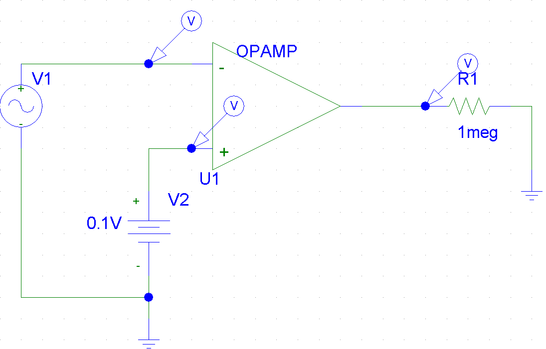 Соберите схему, представленную на рис. 3. Проведите анализ переходных процессов с параметром Final Time = 100ms. Параметры источника синусоидального напряжения: DC = 0, AC = 1, VOFF = 0, VAMPL = 15, FREQ = 50. Зарисуйте полученные осциллограммы. По осциллограмме определите величину опорного напряжения.