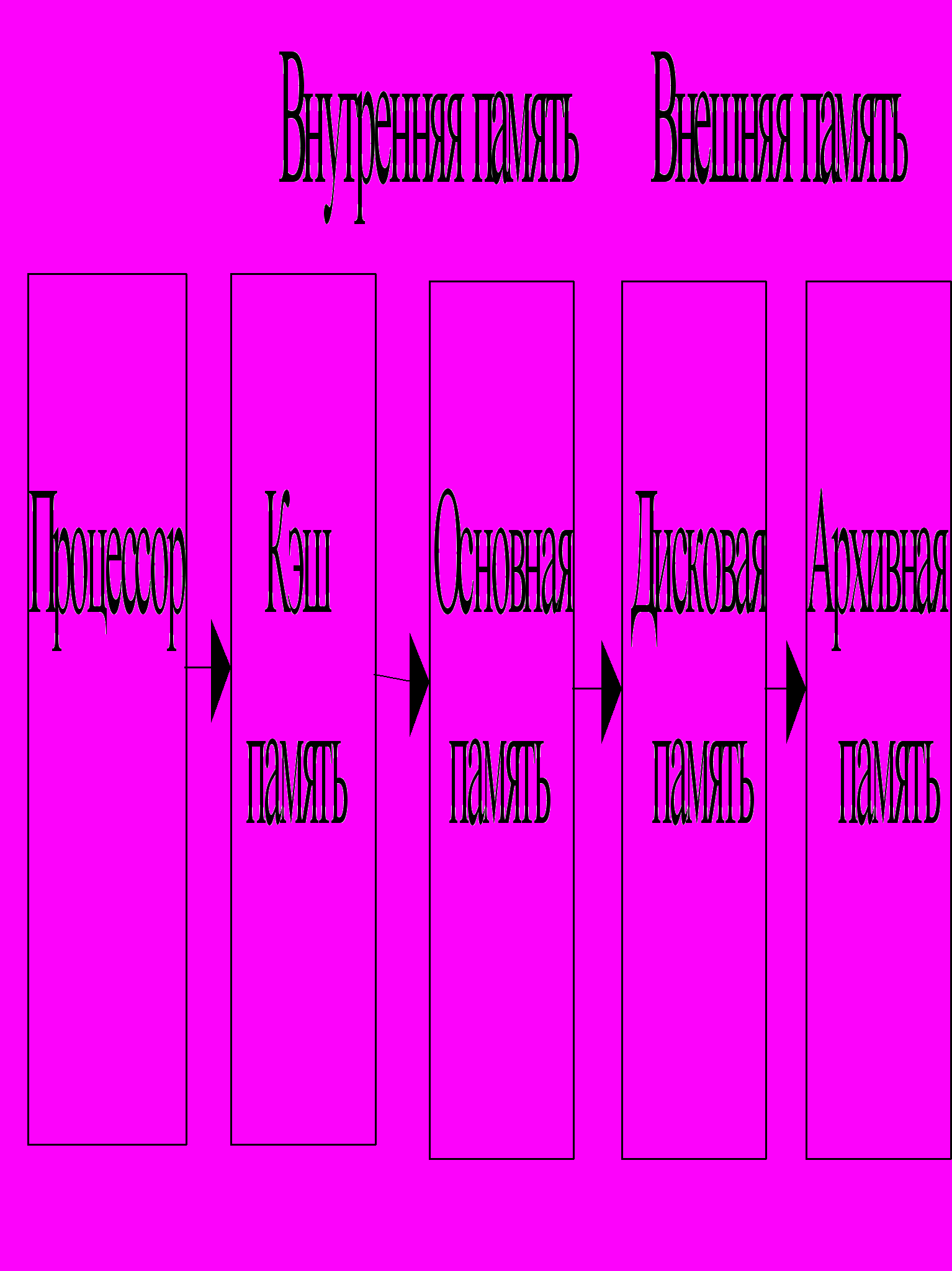 Развитие средств вычислительной техники связано с устойчивой тенденцией увеличения информационной емкости и быстродействия вычислительных систем. Память современных универсальных компьютеров должна иметь информационную емкость 107..1012 байт при времени выборки 2…20 нс. Эти параметры должны сочетаться с высокой надежностью, низкой стоимостью, малым энергопотреблением и приемлемыми массой и габаритными размерами. На современном уровне развития техники невозможно реализовать память с требуемыми параметрами в виде единого устройства, поэтому ЗУ современных вычислительных систем имеют многоуровневую иерархическую структуру, позволяющую в определенной мере удовлетворить всем предъявляемым требованиям. Непосредственно связанные с процессором модули памяти составляют верхние уровни иерархии. Они имеют максимальное быстродействие, но относительно малую информационную емкость. На остальных уровнях иерархии модули памяти располагаются по мере увеличения информационной емкости и связанного с этим уменьшения быстродействия. Запоминающие устройства верхних уровней иерархической памяти образуют внутреннюю память, а ЗУ нижних уровней – внешнюю память компьютеров.