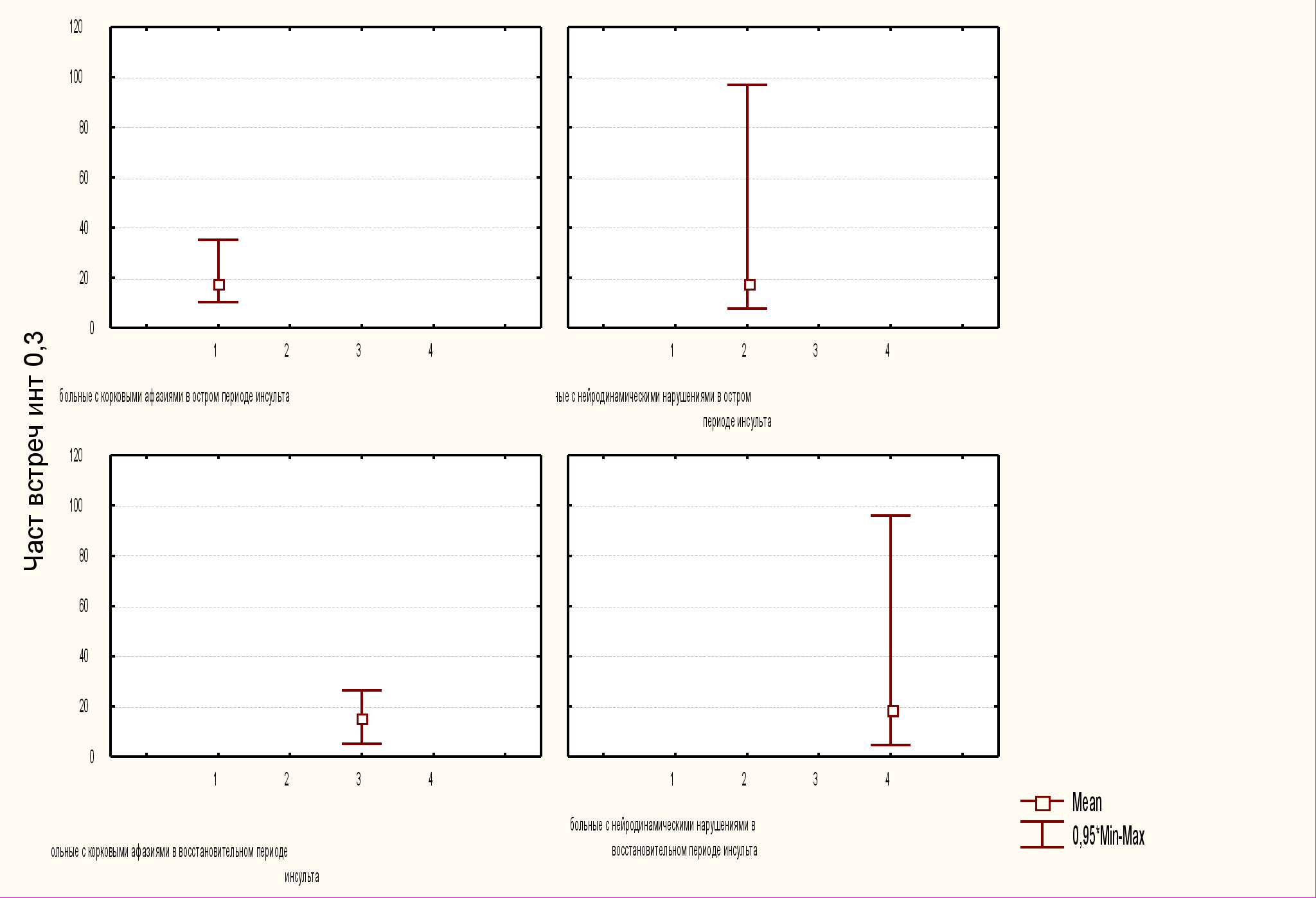 Таким образом, проявления нейродинамических афазий сходны по объективным параметрам темпо-ритмовой структуры в остром и восстановительном периодах инсульта и имеют принципиальные отличия от корковых моторных афазий наличием выраженной вариабельности временных параметров речи.