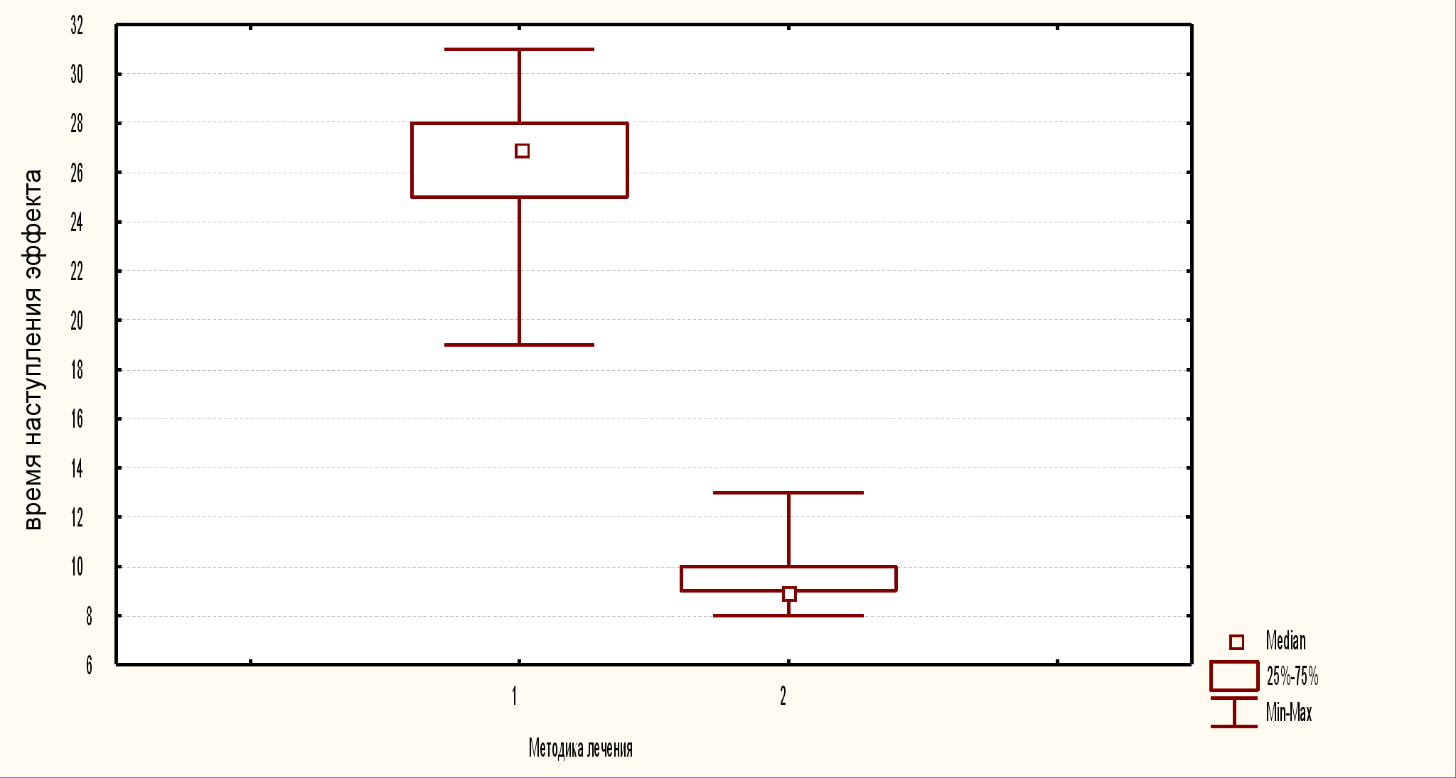 Рис. 10. Результаты непараметрического анализа сравнения групп больных с нейродинамическими нарушениями речи в восстановительном периоде инсульта, получающих курс логопедической терапии (1) и логопедической терапии в сочетании с темпо-ритмовой коррекцией (2) по времени наступления эффекта.