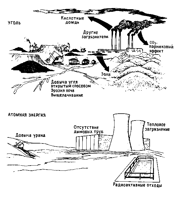 Рис 19. Схема воздействия на окружающую среду АЭС и ТЭС (по Б. Небелу, 1993)