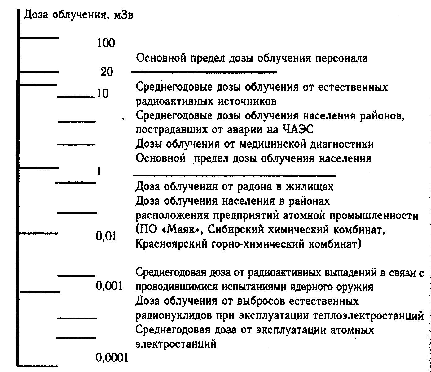 Совокупность обстоятельств, связанных с радиационным загрязнением привела к значительному пересмотру нормативных доз облучения. На рис. 26 приведена сравнительная шкала доз облучения населения от различных радиоактивных источников и рекомендуемых дозовых пределов.