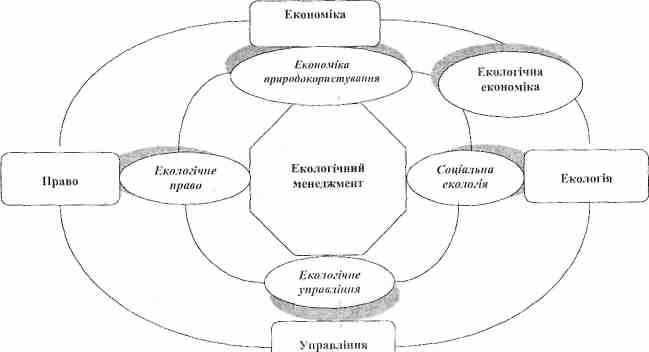 При цьому простежується прямий взаємозв'язок екоменедж-менту з іншими суспільними науками. Екологічний менеджмент є мовби синтезом таких наук як екологія, економіка, право, управління (схема 2). Найбільш тісний зв'язок екологічного менеджменту як інтеграційного наукового напрямку в методичному і категорійно-понятійному аспекті існує з економікою природокористування, що з'явилася декілька десятиріч тому як самостійне наукове відгалуження неокласичної економічної школи, яка намагається примирити економіку й екологію.