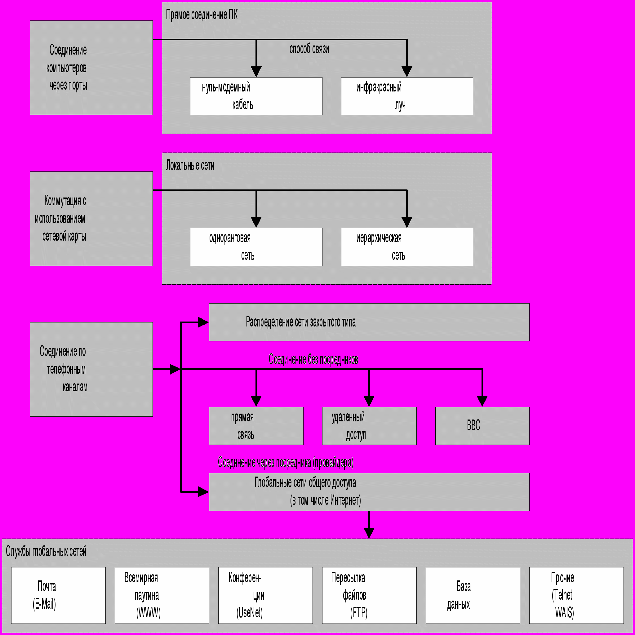 Рисунок 1 - Способы коммутации компьютеров и виды сетей.