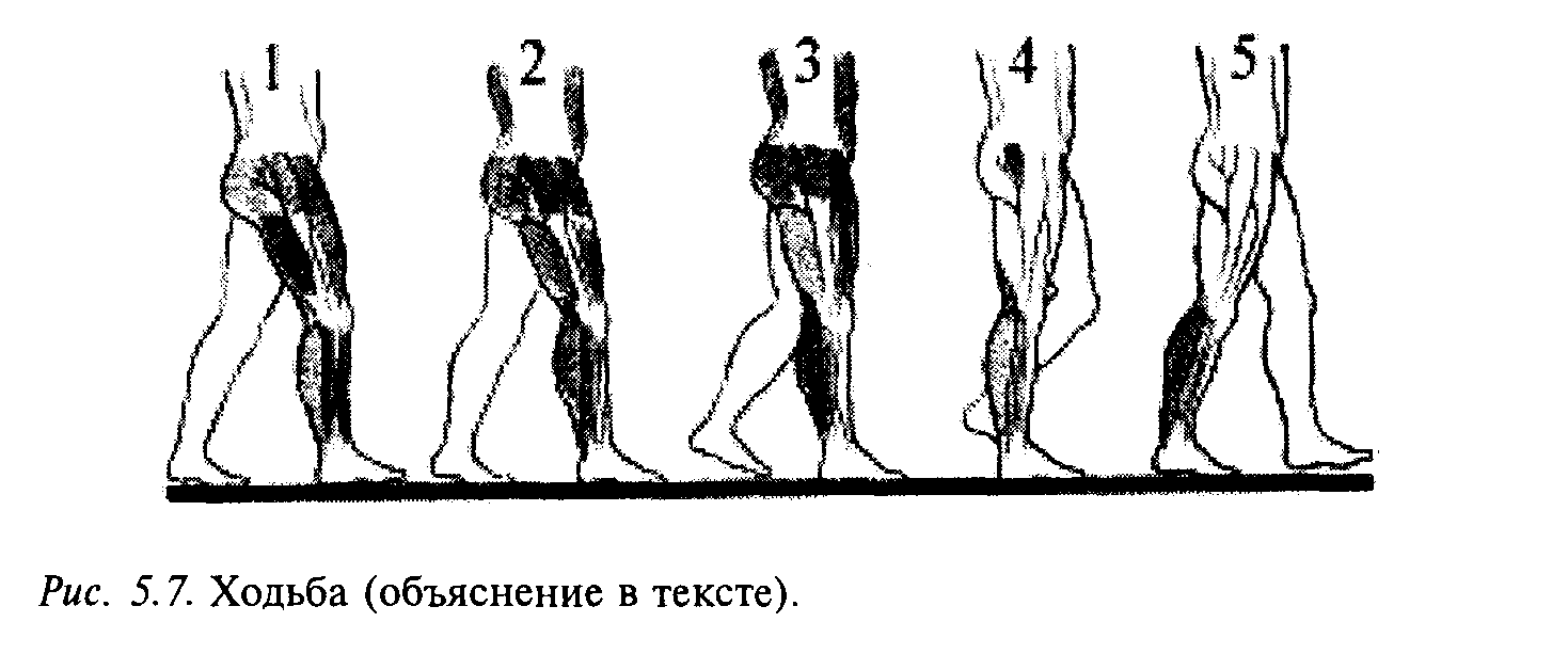 Ходьба является обычной формой локомоции человека и относится к циклическим двигательным актам. Выделяют следующие периоды ходьбы (рис. 5.7). Двухопорный период (1), когда обе ноги стоят на опоре: одноопорный период — для правой ноги (2) и переносный (3) — для левой. Снова двухопорный (4) и затем одноопорный (5) для левой ноги. Во время опорной фазы происходит перекатывание стопы с пятки на носок. В опорных стадиях выделяют передний и задний толчки: первый — при переносе на грузки на опорную ногу, второй — при отталкивании ноги от опоры. В ходьбе участвуют мышцы стопы, голени, бедра и тазового пояса.