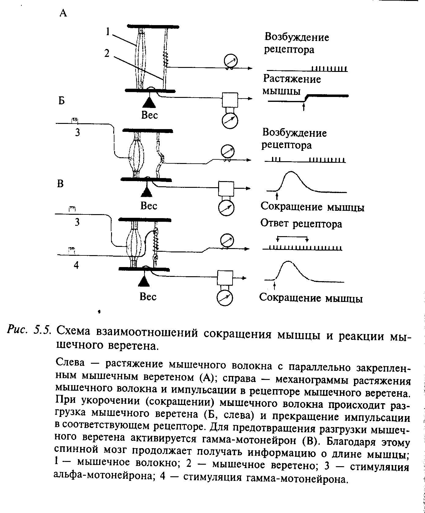Таким образом, состояние мышцы контролируется двумя типами рецепторов — мышечными веретенами, передающими информацию о длине мышцы и скорости изменения этой длины, и сухожильным рецептором, который сигнализирует о силе мышечного сокращения.