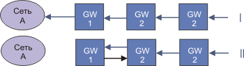 На верхней части рисунка показана ситуация, когда маршрутизаторы указывают маршрут до сети в соответствии со стрелками. На нижней части связь на участке GW1