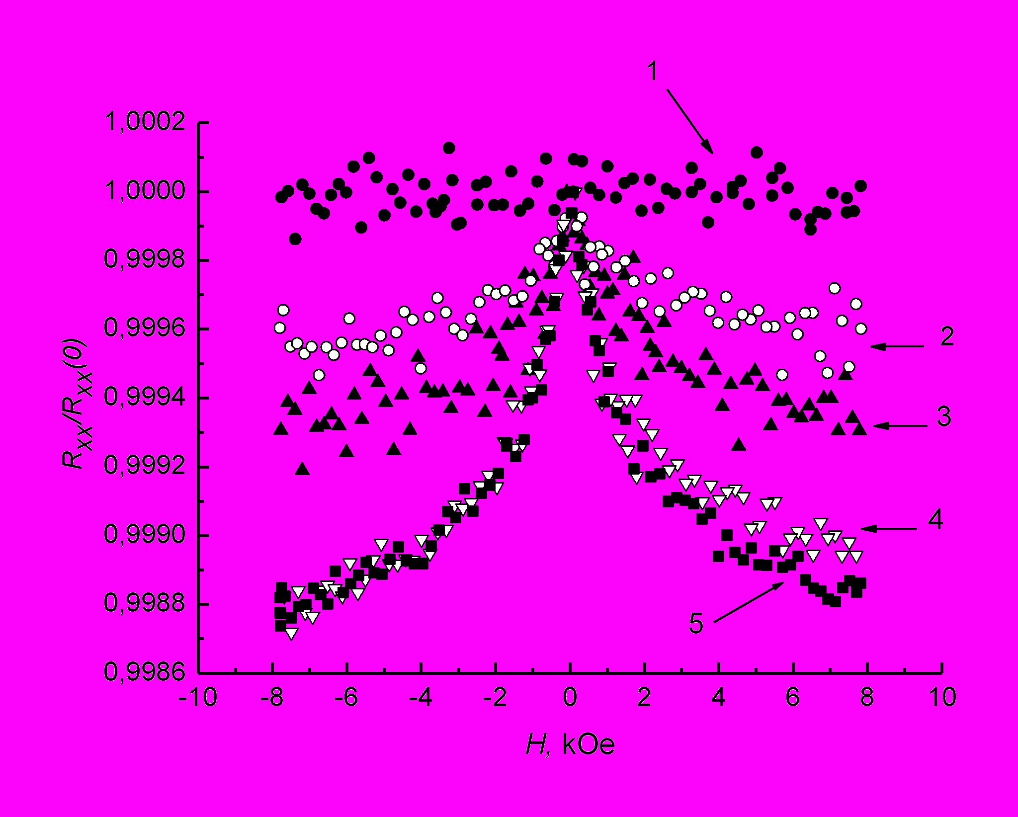 Рис.1. Зависимость сопротивления структур (Co0.45Fe 0.45Zr0.1/a-Si)100 от магнитного поля при Т = 300 К. Толщины металлических слоев и слоев аморфного Si для образцов соответственно: 1-3.5нм, 3.4нм; 2 -2.8нм, 1.9нм;3 -2.6нм, 1.2нм; 4 -2.5нм, 0.8нм; 5- 2.5нм, 0.7нм.