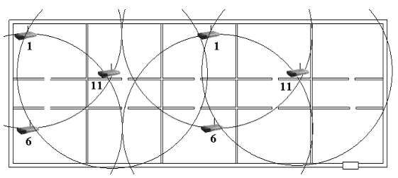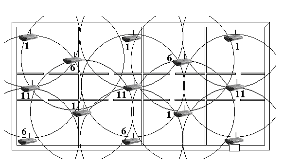 При размещении точки доступа при развертывании малой сети следует обеспечить достаточное качество связи на всех рабочих местах, а также удобство в размещении самой точки. Типовое решение - закрепить точку доступа непосредственно на фальш-потолке, при этом провода электропитания и проводной сети будут проходить над фальш-потолком либо в коробах. Необходимо иметь в виду, что при расширении сети и увеличении количества пользователей скорость связи будет падать (пропорционально числу пользователей). Наибольшее разумное количество пользователей обычно составляет 16-20. Помимо этого скорость и качество связи зависят и от расстояния между клиентом и точкой. Эти соображения могут потребовать расширения базовой сети. Для расширения сети можно использовать uplink-порт точки доступа. Он может использоваться как для объединения базовых зон обслуживания в сеть, так и для интеграции в имеющуюся проводную или беспроводную инфраструктуру, например для обеспечения пользователей доступом к разделяемым ресурсам других подразделений или для подключения к Internet. При расширении сети необходимо следить чтобы частоты соседних точек доступа не перекрывались во избежание взаимных помех и снижения скорости передачи. Это достигается настройкой соседних точек на неперекрывающиеся по частоте каналы 1, 6 и 11. Чередуя каналы таким образом, что соседние точки с каналами 1, 6 и 11 окажутся в вершинах равностороннего треугольника, можно охватить беспроводной связью сколь угодно большую площадь без перекрытия частот (рис. 2.32.).