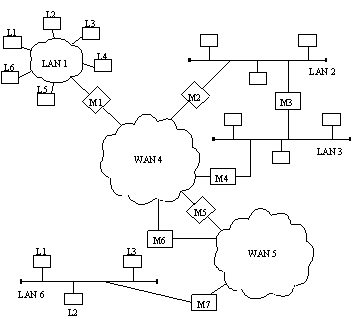 | M1, M2,…, M7 – маршрутизаторы LAN1, LAN2, LAN3, WAN4, WAN5, LAN6 – уникальные номера сетей в едином формате L1, L2,… – локальные номера узлов (дублируются, разный формат) |