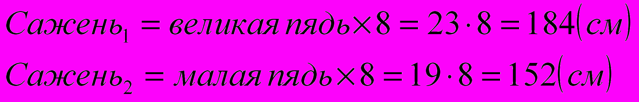В древности на Руси сложились две независимые системы мер длины. Первая основывалась на великой пяди, а вторая на малой. Каждой пяди соответствовала своя сажень, при этом пядь составляла 1/8 часть сажени. Какова была величина сажени в сантиметрах в одной и в другой системе?