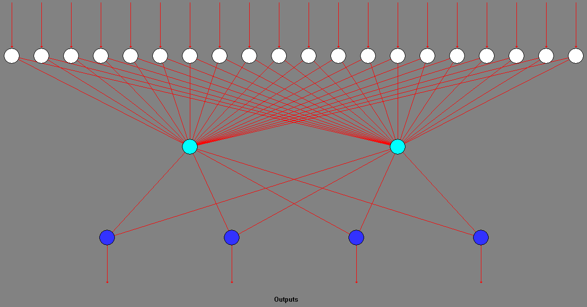 Полученные три варианта транспонирования одной и той же ДППМ используются в обучении трех нейронных сетей. Входами в сеть будут значения параметров всех ячеек вошедших в один слой. Выходами - любой целевой параметр, значение которого известно по предыстории, но не известно в будущем (см. рисунок 3). Следует отметить, что на рисунке изображено схематическое изображение нейронной сети, реальная сеть состоит из трёх слоёв нейронов, число нейронов в каждом слое колеблется в пределах от 80 до 100 штук в каждом слое (в зависимости от сети). В качестве наиболее эффективного метода обучения сети был выбран – метод сопряжённых градиентов.
