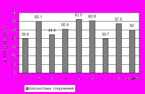 Рисунок 4. – Сравнение долей площадей, занятых под плоскостными сооружениями, от всей территории по объектам: 1- Аэроплаза, 2 – Арена, 3 – Атлантик, 4 – Болоев, 5 – Атрио, 6 - Линкор, 7 – Монблан, 8 – Стелс. Приведены средние значения.