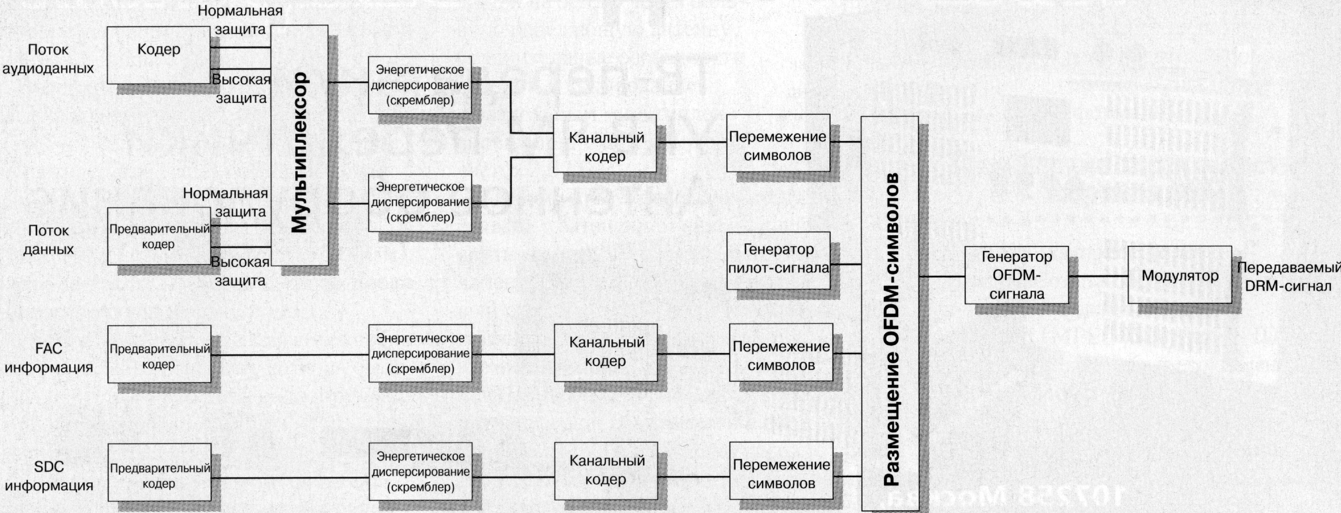 7. Построение и анализ технологической цепи, обеспечивающей наземное цифровое вещание в формате DRM. Основные требования, предъявляемые к электронной аппаратуре, входящей в технологическую цепь DRM радиовещания. Необходимые организационные мероприятия для проведения комплексных работ по разработке отечественной, цифровой аппаратуры DRM радиовещания.