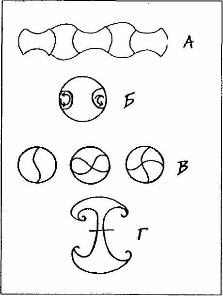 Давайте еще раз вернемся к Общей модели и рассмотрим ее вертикальное сечение, выраженное в простой форме обоюдоострого топора (рис. 3.2А). Соединив в ряд несколько таких форм, мы получим паттерн, напоминающий позвоночник или скелет (рис. 3.6А), — составные части этого паттерна подходят друг другу словно черепица. Латинское название черепицы Tessera, поэтому мы будем называть составные поверхности Тессерообразными (Черепицеобразными)- Закрытая форма общей модели содержит в себе торус (рис. 3.6Б), а если смоделировать в ее пределах маршрут перемещения молекулы, то мы получим схемы, имеющие сходство со многими традиционными мотивами (рис. 3.6В).