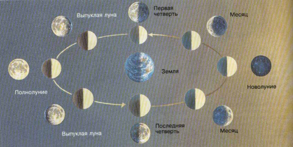![]() | Луна светит отраженным светом и вид фазы (освещенной части Луны) зависит от взаимного расположения Солнца, Земли и Луны. Фаза - отношение площади освещенной части видимого диска Луны ко всей его площади (= отношению толщины освещенной части диска к ее диаметру). р - Луна растет после новолуния, наблюдается вечером с - Луна старая (убывающая после полнолуния), наблюдается утром. Кстати: найдите ошибку художника на этом рисунке. Полный цикл смены фаз (синодический месяц) составляет примерно 29,5 суток . Полный оборот вокруг Земли (сидерический месяц) Луна совершает примерно за 27,3 суток. |